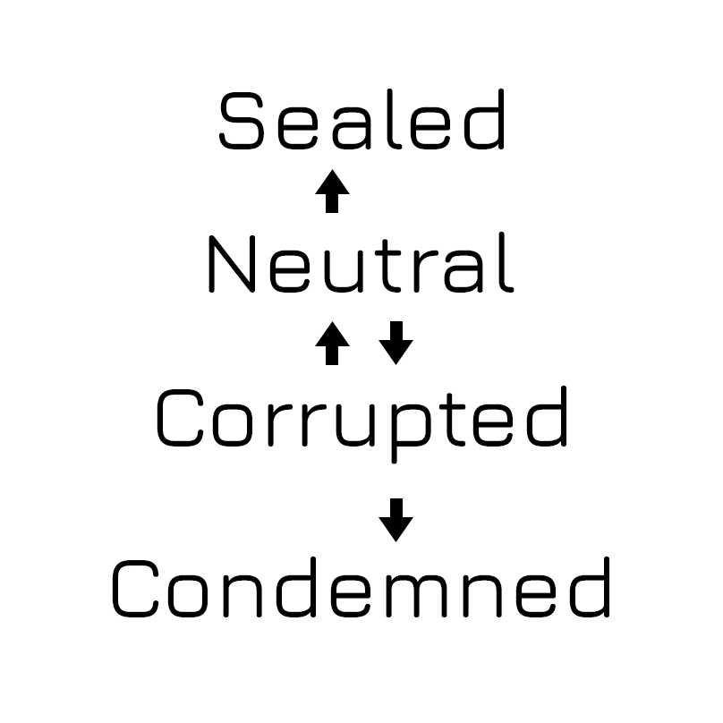 Creatures of this world will have four potential states. Starting as neutral, they can become sealed by the wolf spirit, increasing their strength and making them immune to corruption. They can also go the other way becoming corrupted but with the potential to be freed. If they go beyond corruption they become condemned with no hope redemption. The Great Serpent’s minions are condemned already.