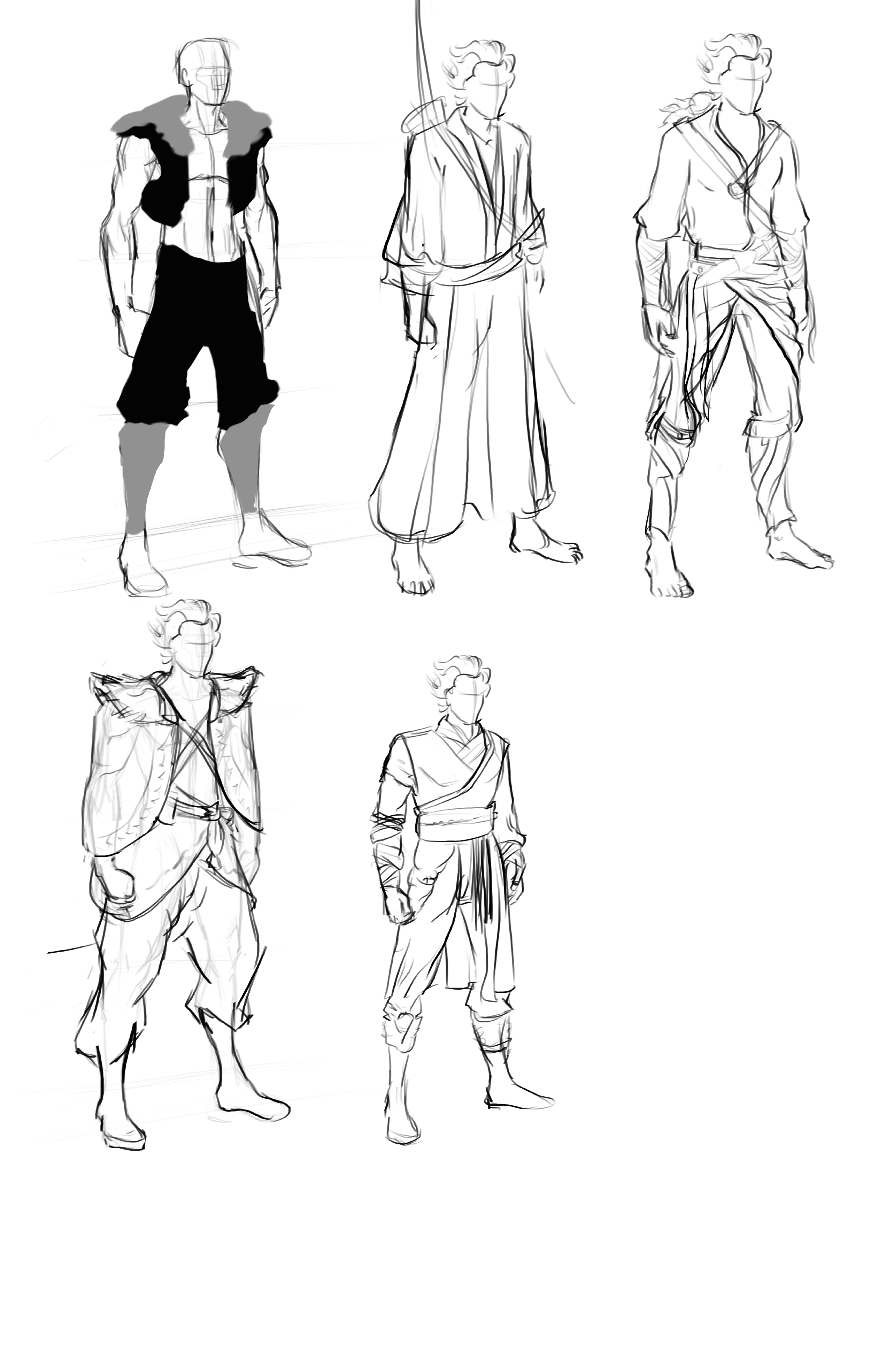 Here are the rough exploration sketches I did and some of my current sculpts. The face is pretty polished, the hair is rough, and the costume is very rough.
